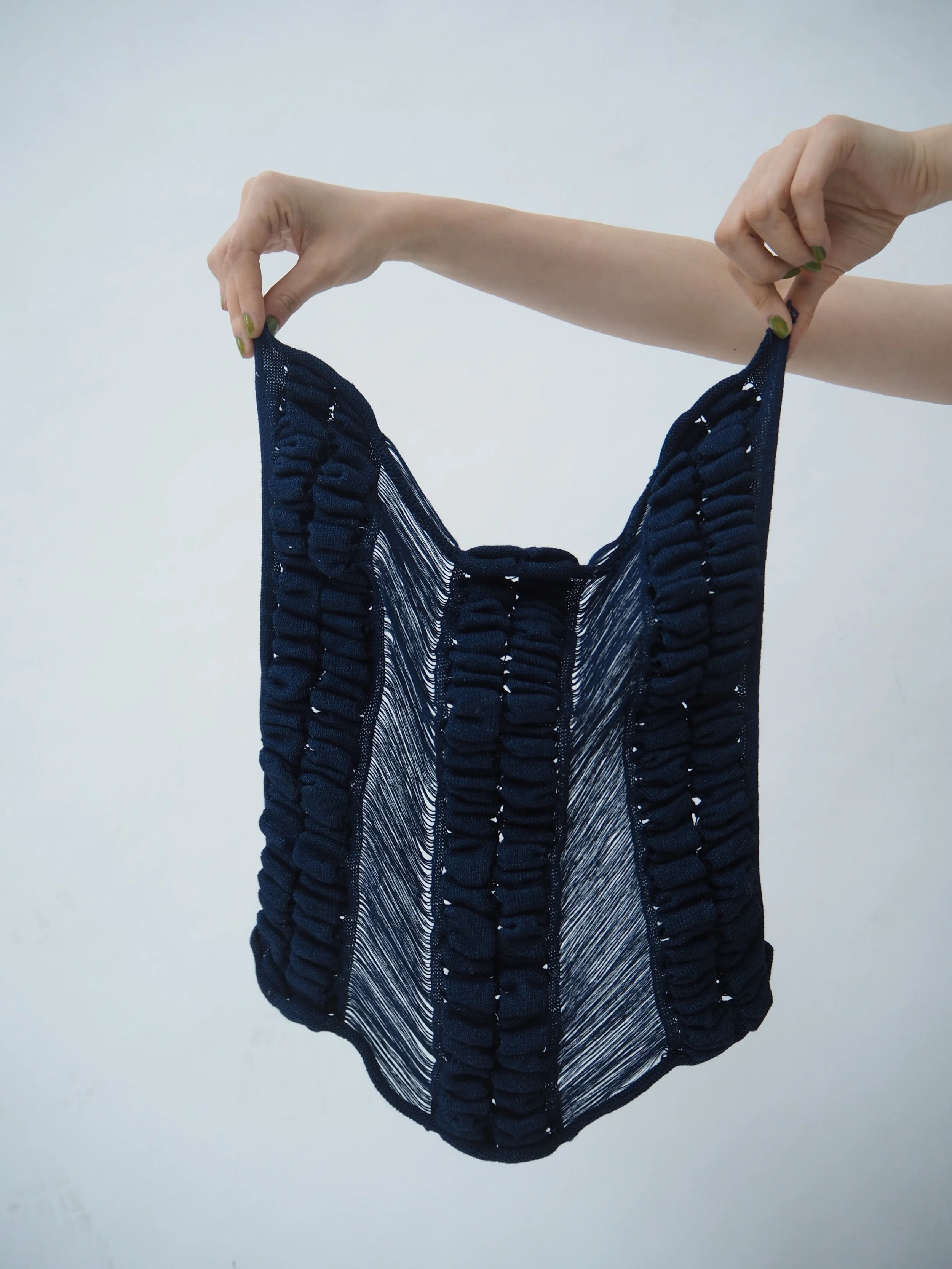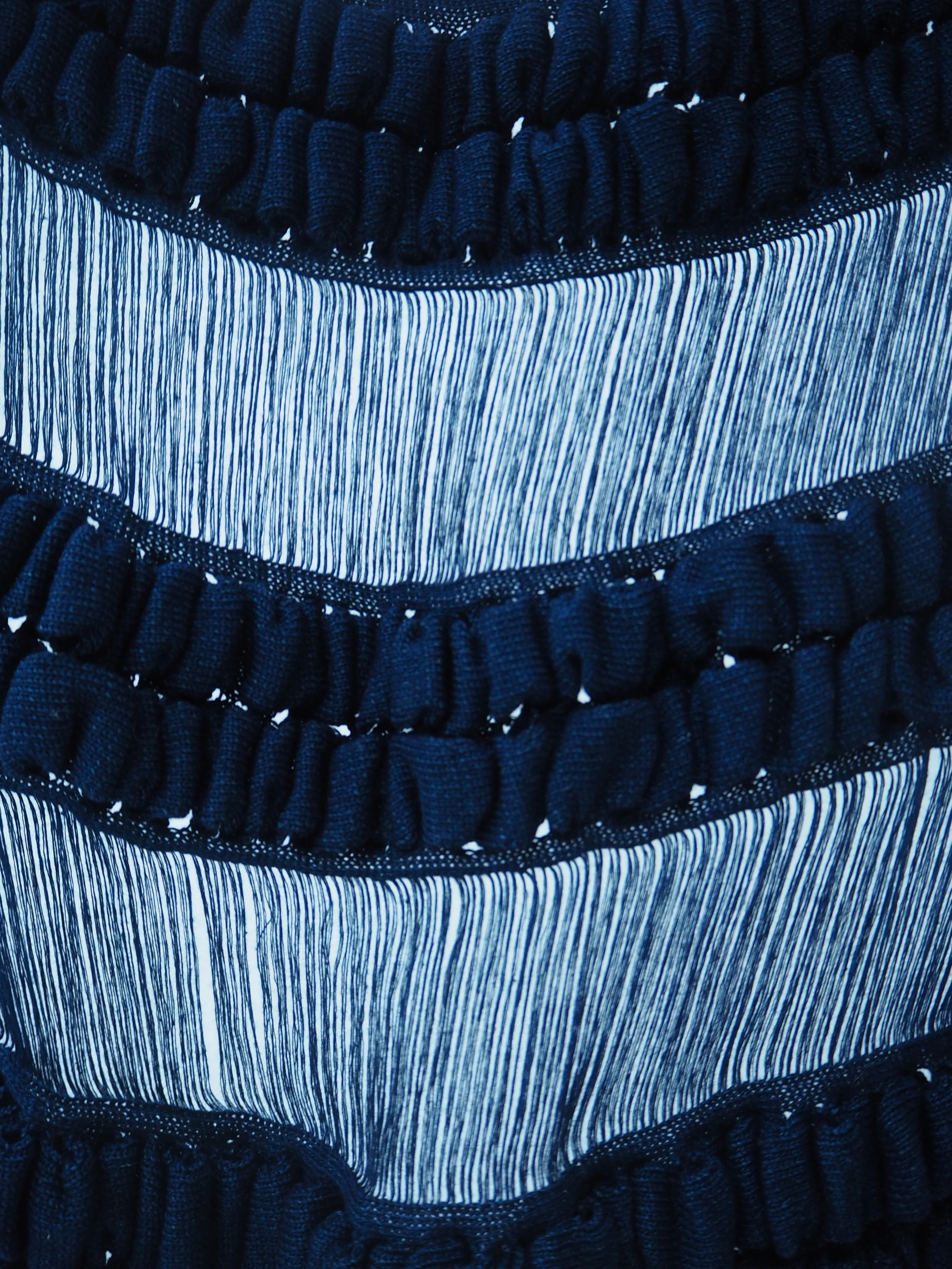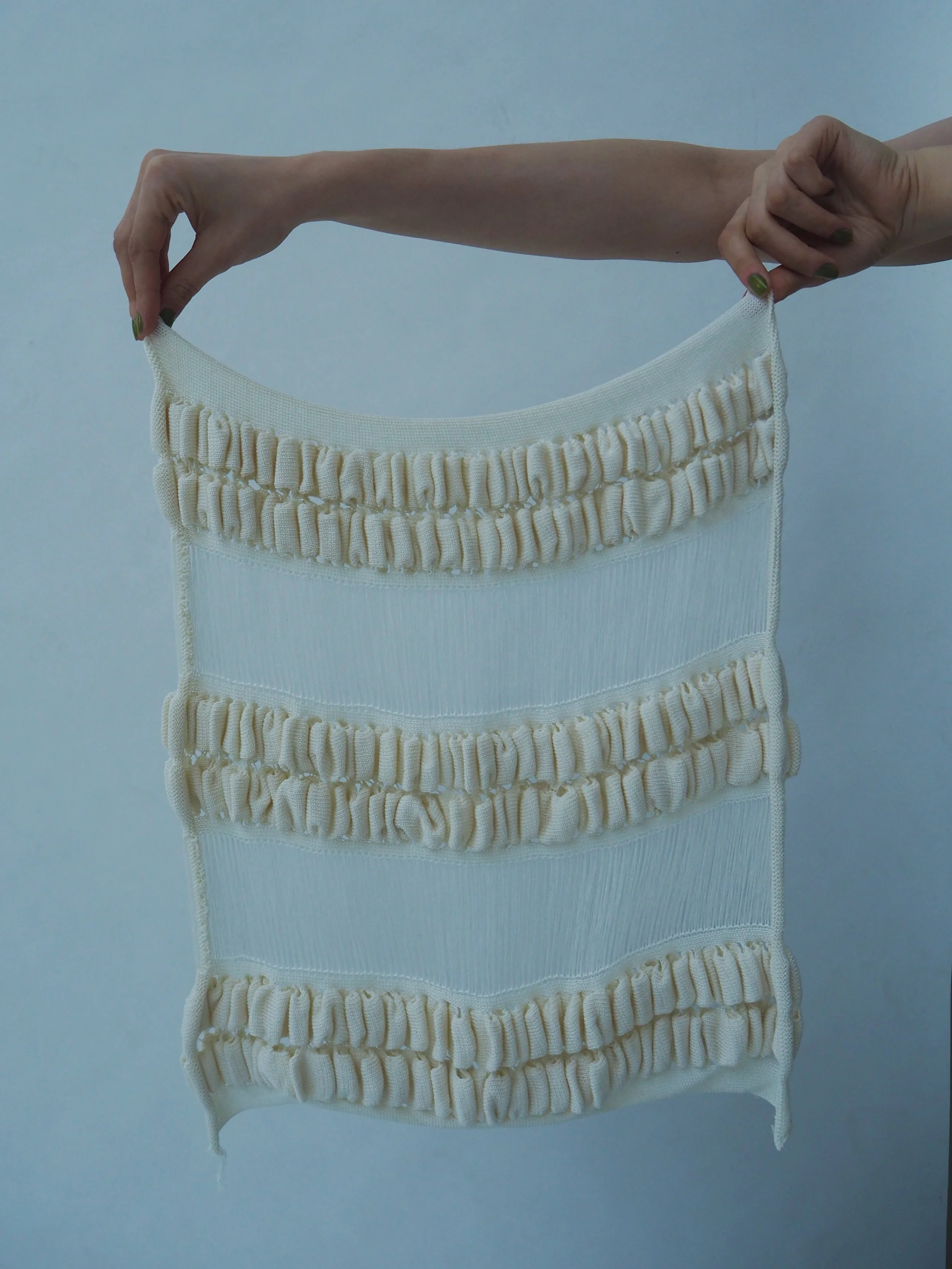 Industrial knits made on a Shima Seiki knitting machine using goring, creating a pleated appearance to give texture next to the smooth floats. The sample is made in a blend of bamboo-viscose and silk.