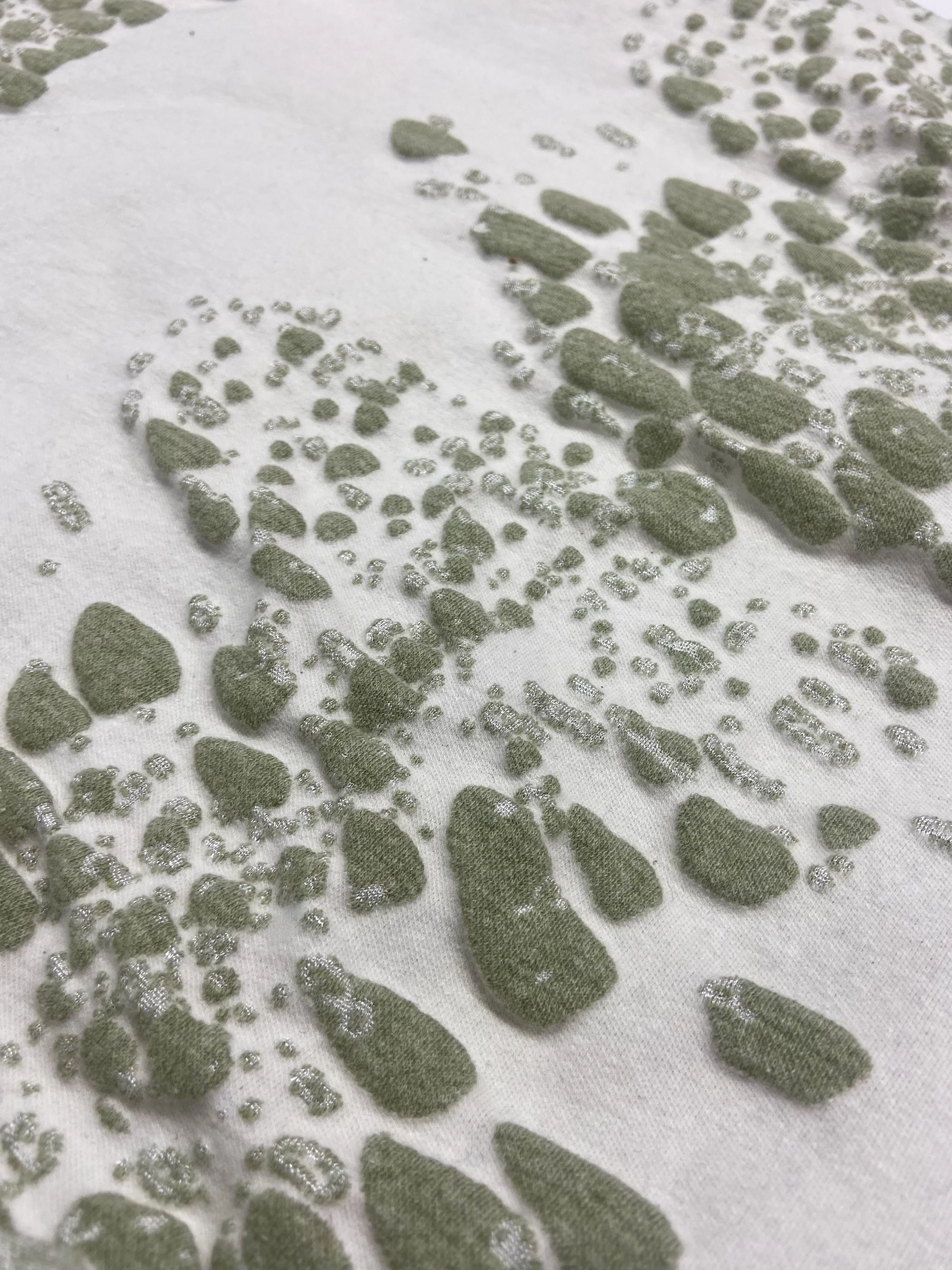 Industrial knits made on Mayer & Cie circular knitting machine. The patterns of the knits play with tactility, using the natural properties of the technique and yarns to create texture. They remind of the rhythms in nature, hinting to moss in a forest, a stone path leading through see-through water or a repetition of leaves on branches.