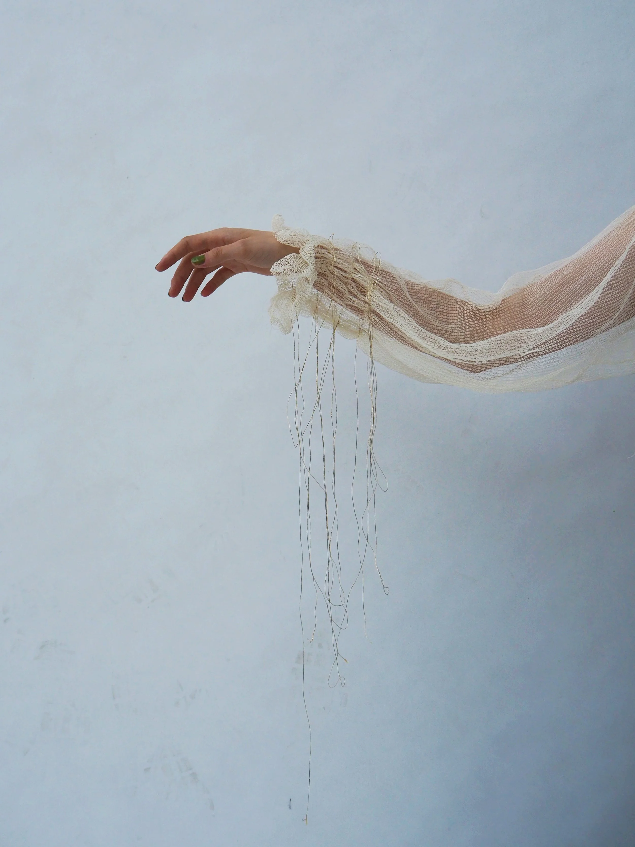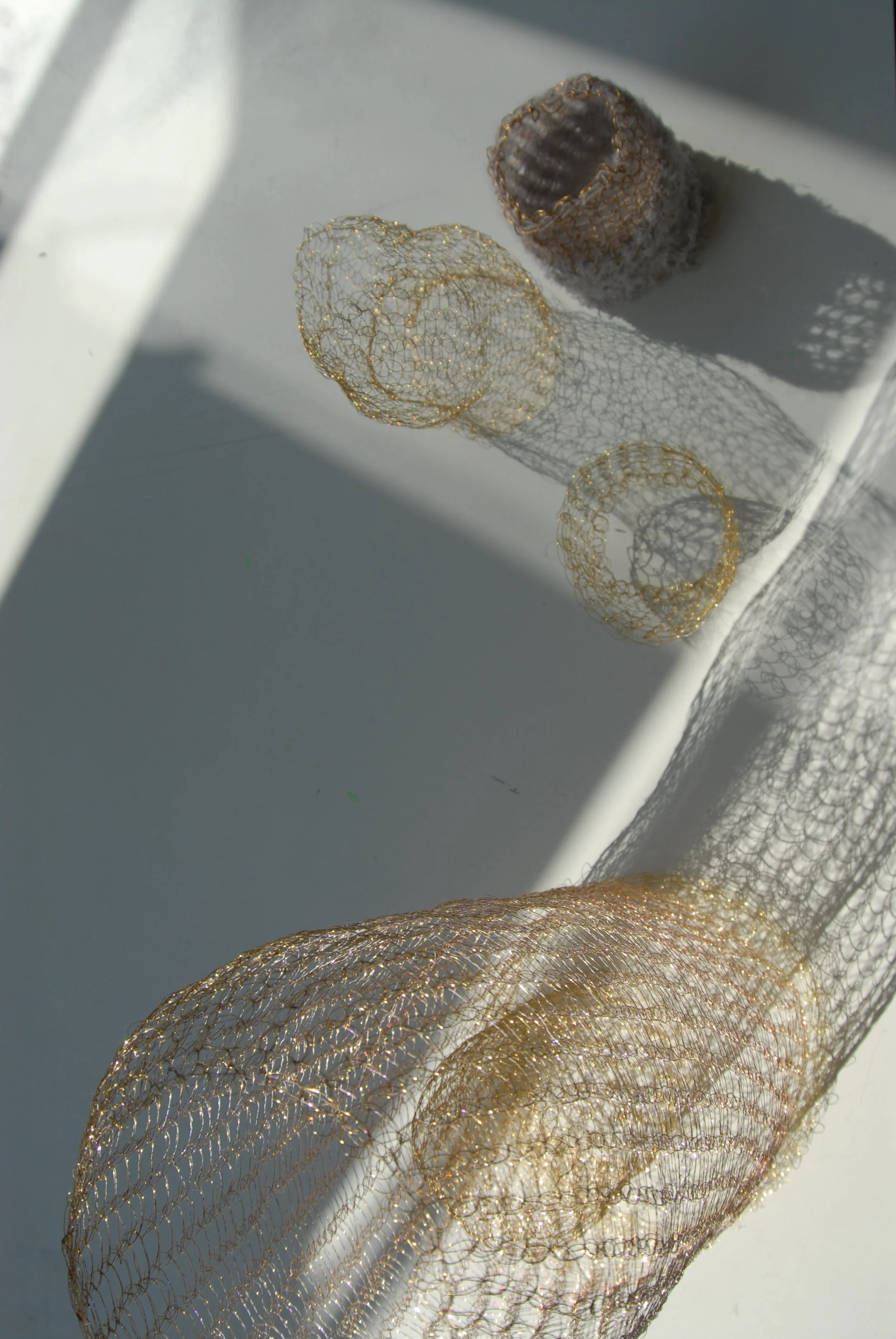 A small knitted collection of studies in metal wire, metallic and coloured yarn. ‘Bouwstof’ is proposing the idea of textile as a new building material by creating fine knitted sculptures, playing with transparency, layering and light. Bouwstof is based around the Japanese concept ‘ma’ 間, giving value to the interval, the simultaneous awareness of form and non-form.