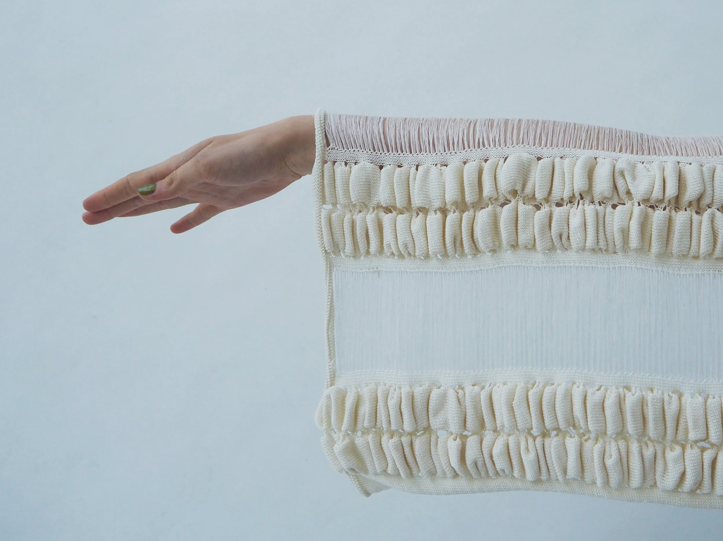 Industrial knits made on a Shima Seiki knitting machine using goring, creating a pleated appearance to give texture next to the smooth floats. The sample is made in a blend of bamboo-viscose and silk.